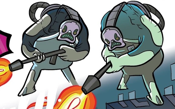 - Several Gellaxis guards appear in the final issue of the comic series as part of the montage of people being caught up in the time loop. Specifically, they're shown escorting an imprisoned Tak.