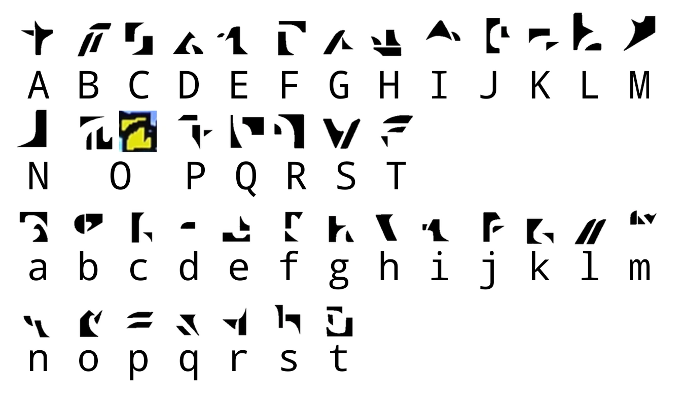 A recreation of the IRKEN DOOM alphabet, a possible base for the Irken alphabet depicted in the DVD subtitles.