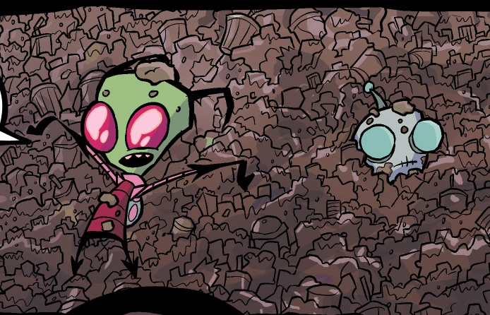 As GIR decides that the outdoors is "pretty" and runs out to play, Zim states that it's "disgusting" and goes back inside as the issue ends.