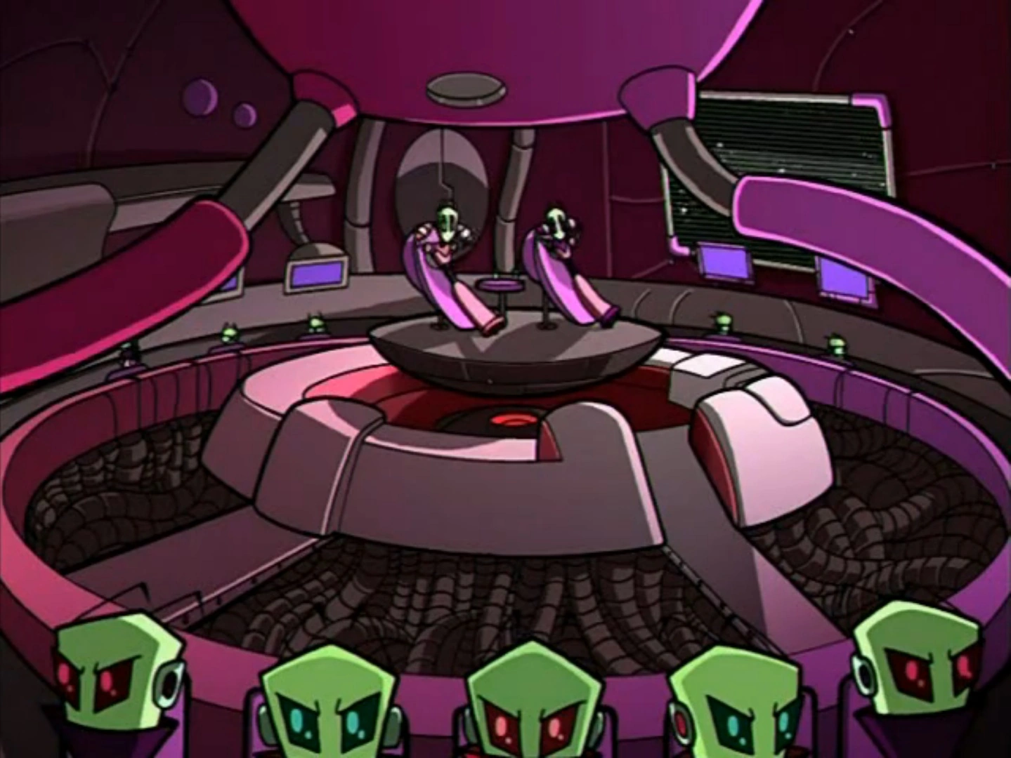 The main chamber, where Almighty Tallest Red and Purple spend most of their time, is equipped with a large screen and with a long-distance communication system, which the numerous Invaders and Zim himself make use of, contacting the Tallest to inform them of their progress in conquering their respective planets. The ship is run by the Navigators, who are also in charge of communications.