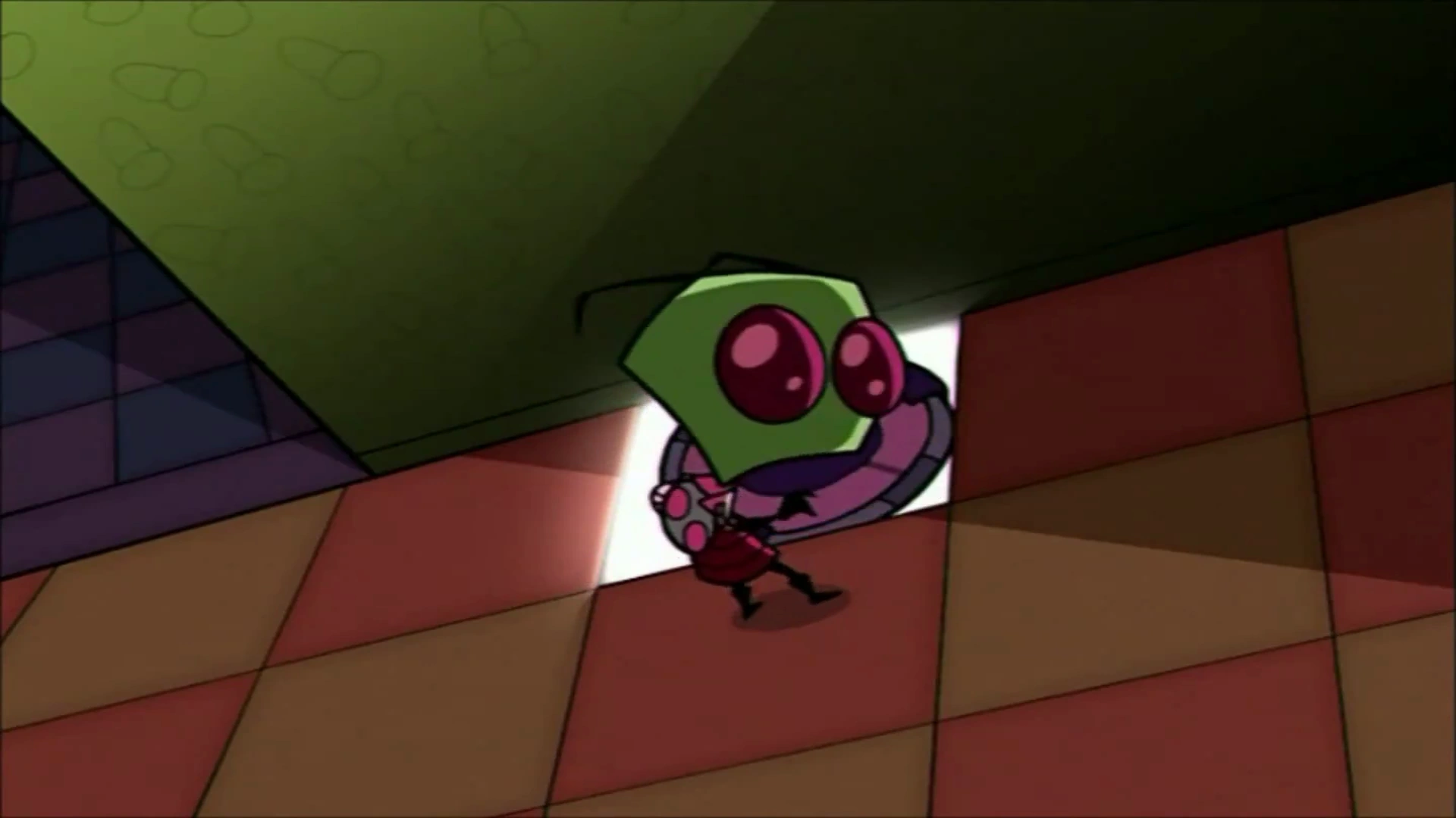 - In the scenes with Zim inside of Dib, Zim's colors are switched around, in which his skin turns pink and his eyes turn green; this gets fixed right when Zim explains his plan to Dib on the television. It could, however, just be how Zim is lit in the ship. This also happens in the Pilot as another goof.