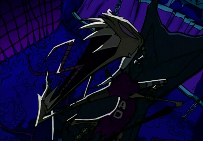 After Zim rescued Dib in the Nightmare Mech, she demonstrated her capability to transform into a giant insect-like creature going from standing on two legs to becoming a hexapod with her tentacles becoming larger and gave chase to the pair. Nightmare Bitters wears a ragged purple dress with vertical white letters spelling the word B A D.