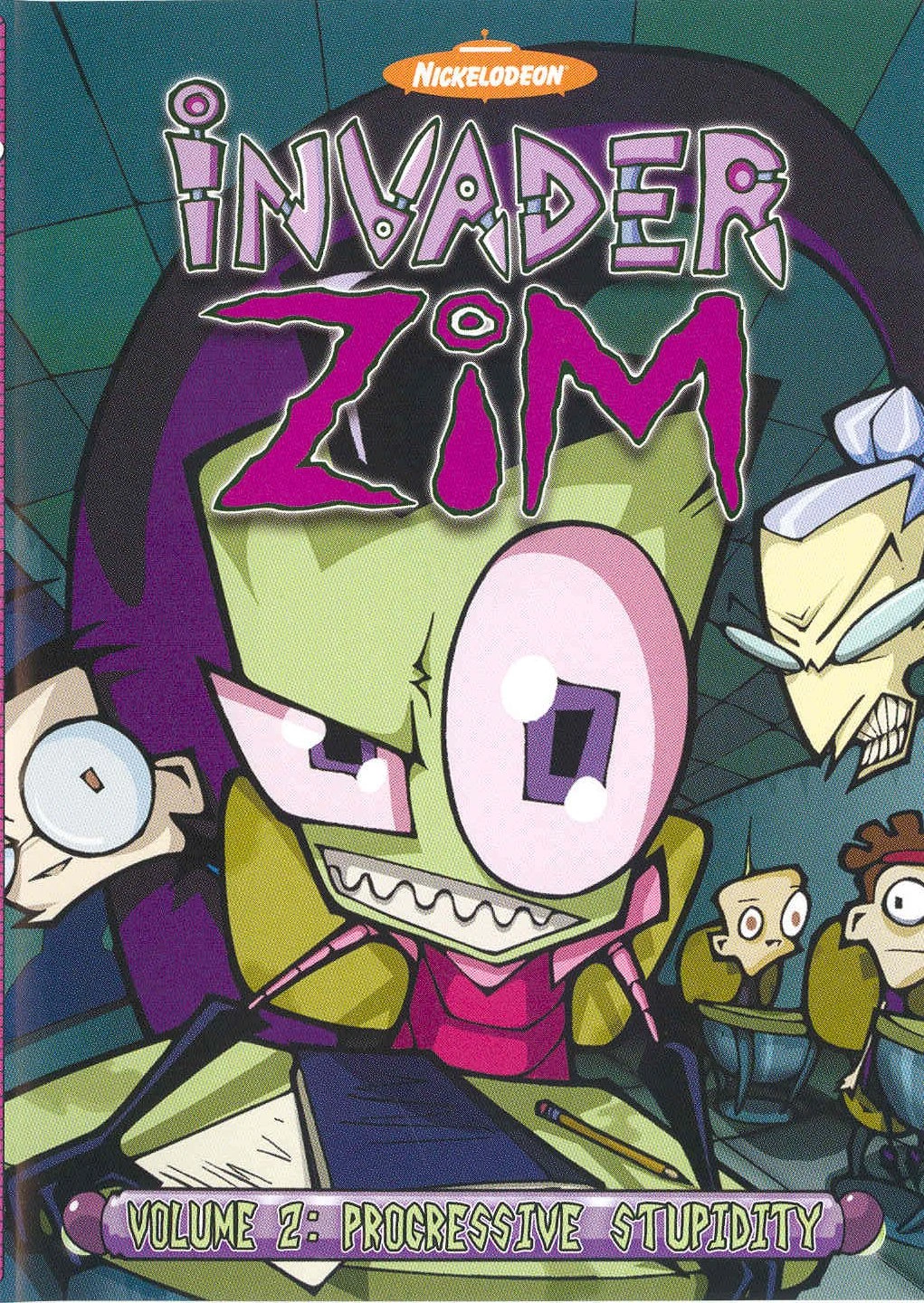 Progressive Stupidity, released on August 31, 2004, is the second volume in Media Blasters' Invader Zim DVD collection.[1] Both Discs feature a choice between English and Spanish voices. Most of the episodes have commentaries and/or animatics. All of them except the interviews come with Irken subtitles.
