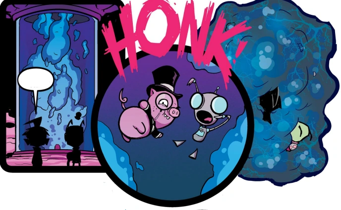 However, GIR gets inside the container with a pig which farts, breaking the container, which causes a "time-poop rupture" that wipes out the entire universe but also results in an never ending time-loop where everyone is forced to relive the same day over and over again, with only Zim and Dib aware of the loop (Zim thanks to a special hat he designed and Dib thanks to a device Gaz shoved into his head).