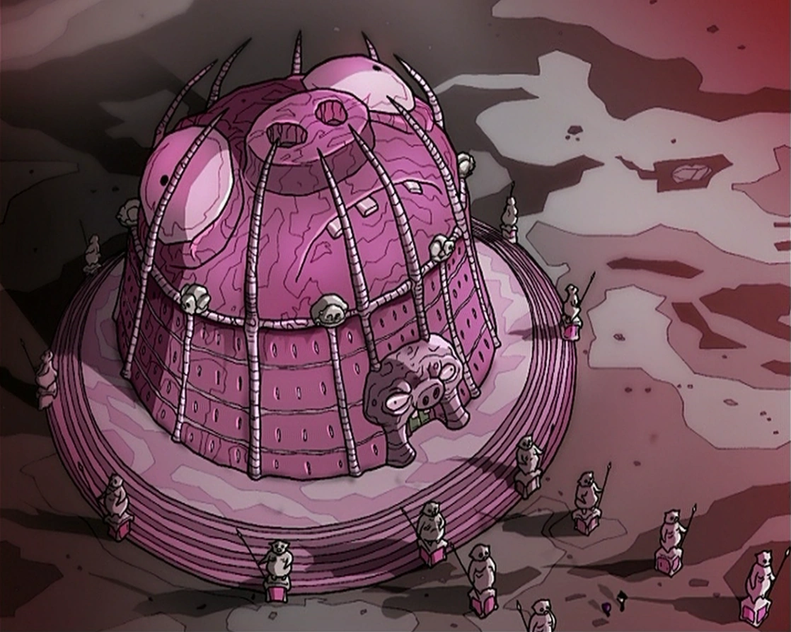 The Pig Realm is currently a relatively small place, perhaps only a few miles across. The ground appears to be made completely out of pork or a similar substance. In the center of this dimension is a large, dome-shaped palace - made of pork. The edges of the dimension are lined by mountains. The sky is red, the clouds are black, and there are a few pig-shaped rocks.