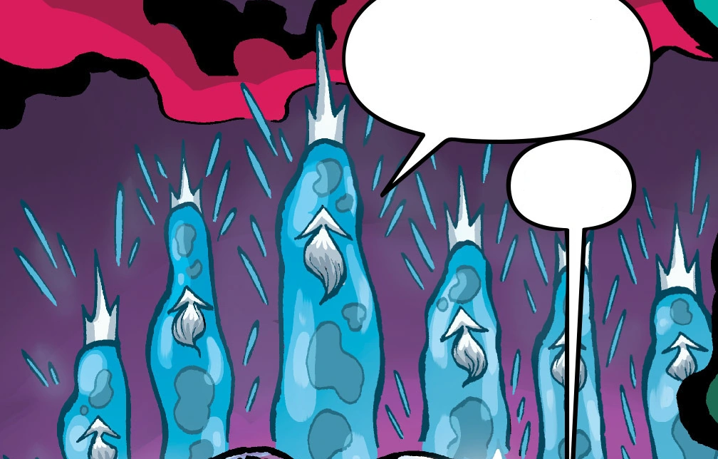 By this point, the creatures are much taller than Zim and have a more blueish color. They also appear to have beards and wear crowns. Zim says he should destroy them just for getting so tall, and the creatures agree and beg Zim to destroy them. Zim is confused, but complies, and destroys the whole planet with a bomb he acquired from Blastropolis.