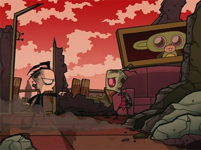 Zim returns to his base, panicking as he imagines how the Tallest will react when they see the catastrophe. However, at that moment, GIR reveals that Dib had not been vaporized by the explosion as Zim had thought: Instead, he was also affected by the slowing effects of the time-stasis field, which gives Zim an idea: throwing Dib into the explosion will cancel out the stasis field's effect, and cause it to explode at its normal speed. Even GIR is skeptical of this idea.